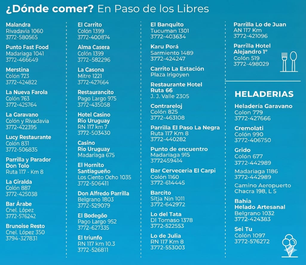 La gastronomía de Paso de los Libres es típica, combinando recetas típicas del nordeste argentino con menúes característicos del sur de Brasil. Acá tenés un listado de bares, restaurantes y locales de comida con entrega a domicilio.